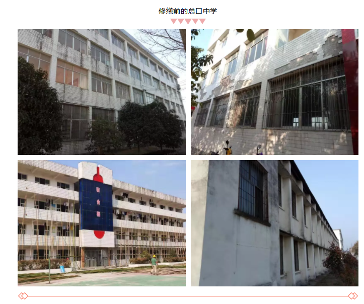 湖北省潛江市總口中學(xué)和總口小學(xué)教學(xué)樓、宿舍樓外立面材料之前分別為瓷磚與涂料,因使用時間長久整體陳舊,大多數(shù)樓棟存在斑駁破損,墻體發(fā)生掉漆、受潮發(fā)霉,瓷磚發(fā)生脫落等情況,不僅影響校園風(fēng)貌,還對孩子們存在一定安全隱患。