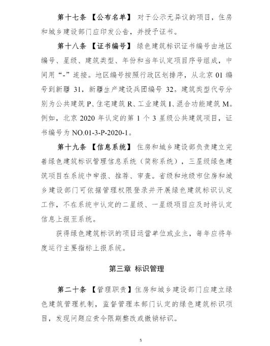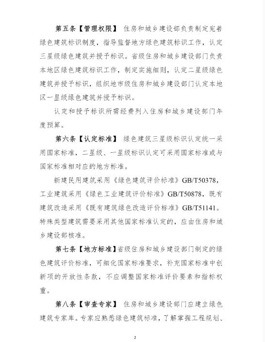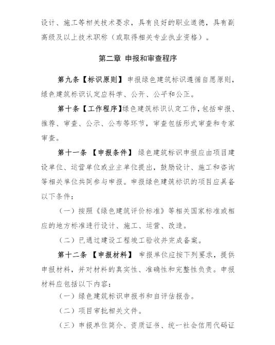 征求意見稿提到,綠色建筑標(biāo)識是指表示綠色建筑星級并載有性能指標(biāo)的信息標(biāo)志,包括標(biāo)牌和證書。綠色建筑標(biāo)識由住房和城鄉(xiāng)建設(shè)部統(tǒng)一式樣,證書由授予部門制作,標(biāo)牌由申請單位根據(jù)不同應(yīng)用場景按照制作指南自行制作。綠色建筑標(biāo)識授予范圍為符合綠色建筑星級標(biāo)準(zhǔn)的工業(yè)與民用建筑。綠色建筑標(biāo)識星級由低至高分為一星級、二星級和三星級三個(gè)級別。