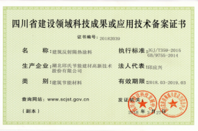 2018年3月27日,我司“建筑反射隔熱涂料”獲得四川省建筑領(lǐng)域科技成果或應(yīng)用技術(shù)備案證書。為促進(jìn)建筑領(lǐng)域科技成果推廣轉(zhuǎn)化,推動(dòng)產(chǎn)業(yè)技術(shù)升級(jí),根據(jù)《中華人民共和國(guó)促進(jìn)科技成果轉(zhuǎn)化法》和《建筑領(lǐng)域推廣應(yīng)用新技術(shù)管理規(guī)定》,四川省建設(shè)廳將新技術(shù)